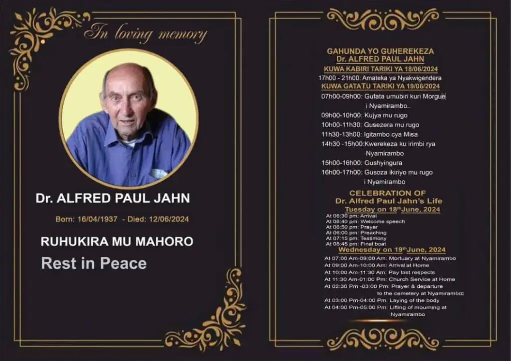 Umuryango wa Dr Alfred Paul Jahn watangaje ko ku wa 19 Kamena 2024 aribwo azashyingurwa. Ku mugoroba wo ku wa Kabiri taliki ya 18 Kamena 2024 nibwo hazaba umuhango wo kwizihiza ubuzima bwe.